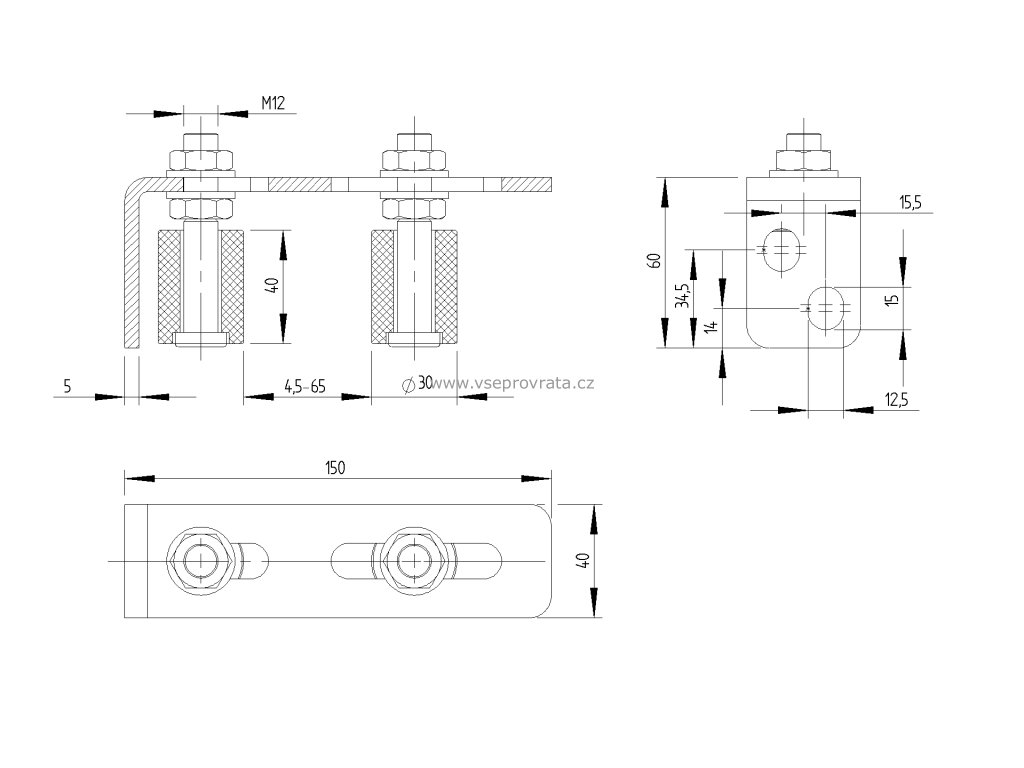 Horní vedení posuvné brány, s dvěmi rolnami pr.30 mm, nastavitelná rozteč mezi rolnami 4,5 - 65 mm. Konzola 150 x 60 mm, zinkovaná.