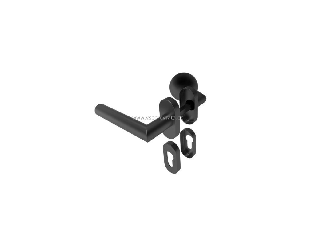 Sada kliky L a pevné vyosené koule z černě lakované nerezi K320 / AISI304 s oválnou rozetou. Součástí sady jsou také rozety na cylindrickou vložku.