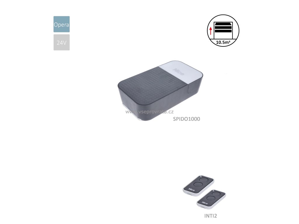Sada stropního pohonu NICE SPIDO 1000 KLT pro sekční garážová vrata s plochou do 10,5 m2 a maximální výškou 2 400 mm (maximální výšku vrat ovlivňuje typ kování) s jednodílnou řemenovou vodící dráhou SR32B, vestavěnou řídící jednotkou s displejem pro snadné nastavení paramertů a integrovaným přijímačem dálkového ovládání. Upozornění: vestavěný přijímač dálkového ovládání není kompatibilní se staršími ovladači NICE FLO.R a FLO.RE.