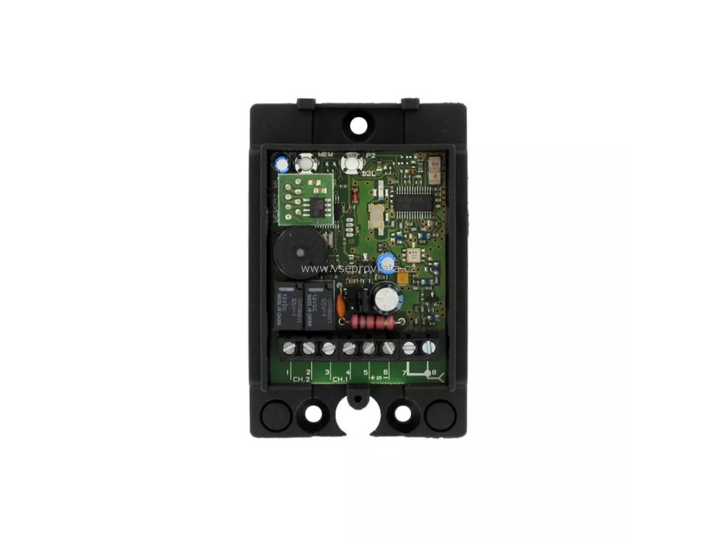 Teleco TVRCM868A02, externí přijímač dálkového ovládání pro dálkové ovladače Teleco s plovoucím kódem, frekvence 868,3 MHz. Napájecí napětí 12 nebo 24 V AC/DC, výstupní bezpotenciálové relé s maximální zatížitelností 1 A. Maximální počet uložených kódů (tlačítek) : 42.
